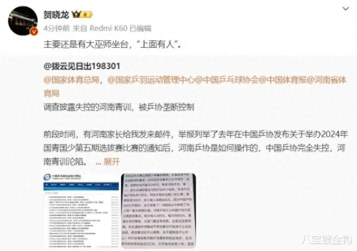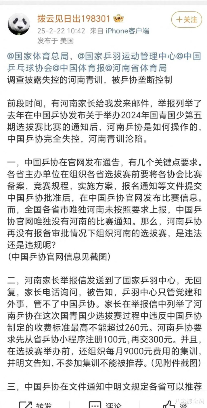 近日,一位网名为“拨云见日出198301”的博主在社交媒体上发文,披露了河南乒协在青训工作中存在的一些问题。这些问题主要包括: